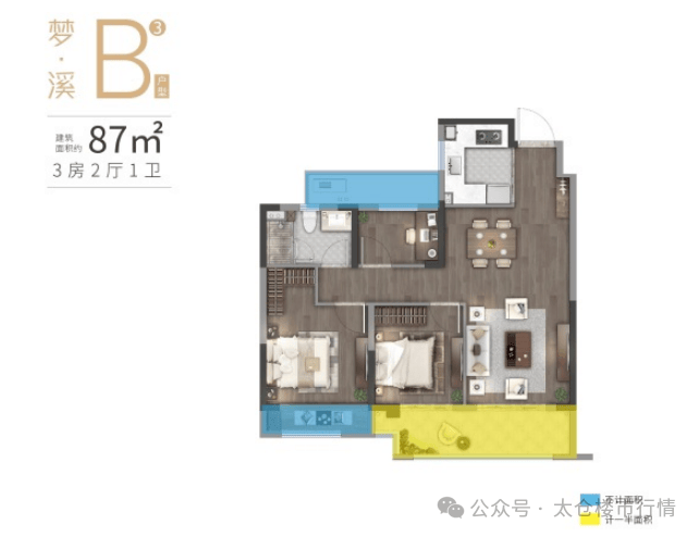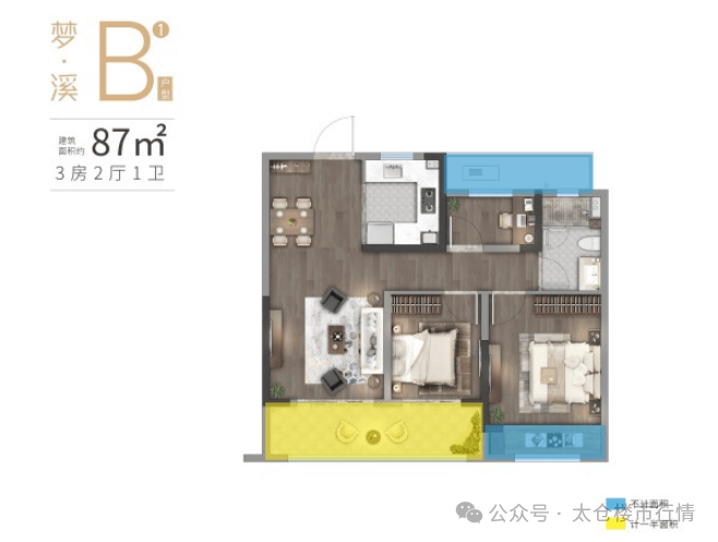 87㎡(3 房 2 厅 1 卫):三开间朝南,南向双卧,北侧灵动空间可改书房 / 儿童房。