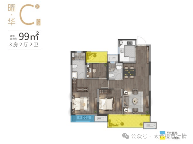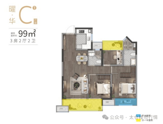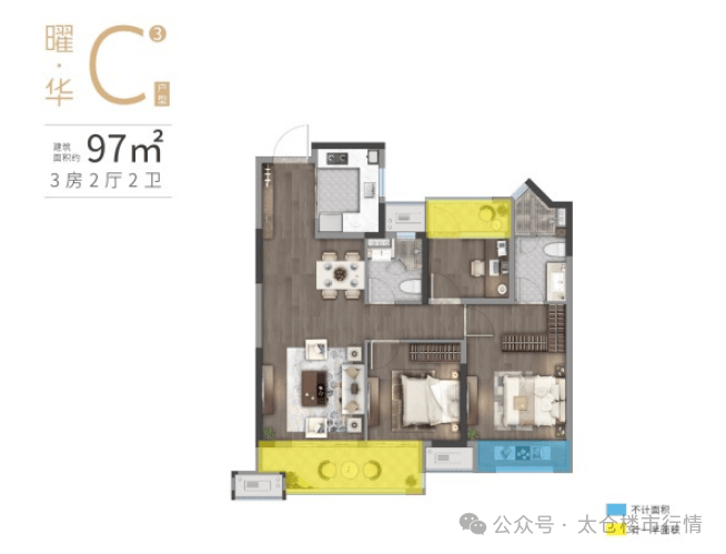 97-99㎡(3 房 2 厅 2 卫):主卧套房(独卫 + 衣帽间),双卫设计,三口之家一步到位。
