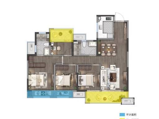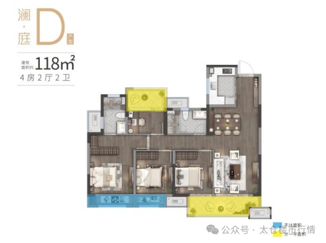 118-119㎡(4 房 2 厅 2 卫):四开间朝南,阔绰四房,满足三代同堂。