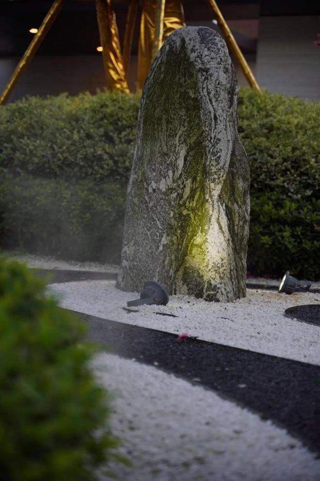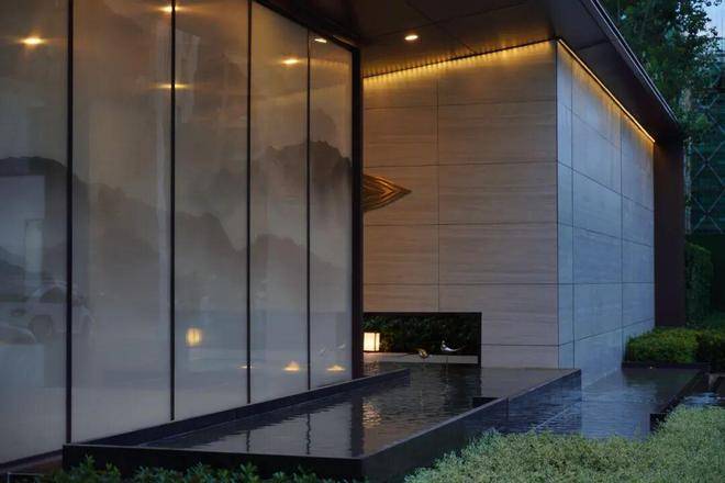 规则的绿植、层叠的水景营造入口空间体块感的同时也消除了门廊和围墙的生硬感,结合灯光、小品,为空间注入一抹灵动与温暖。