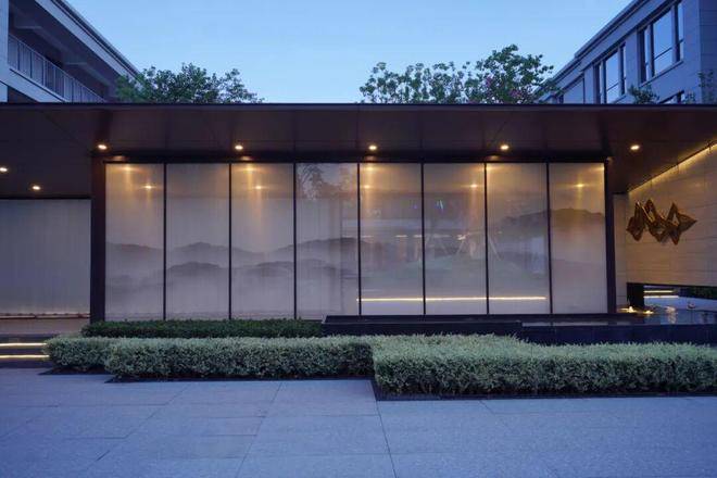 门廊以虚实相间的形体划分入口空间,山水画卷屏风营造入口仪式感,玻璃景墙与内庭的自然景观光影交织,隐约可窥内庭,半遮半掩却又不失端庄。
