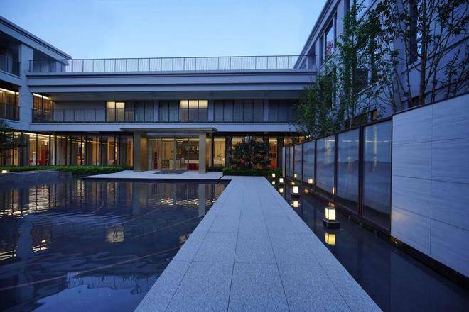 中庭景观用水,石,林,泉,四要素营造出一个宁静温和的中庭空间。穿过门廊,一幅山水庭园展现眼前,让人赏心悦目。漫步于水中步道,空间在变,人的感受也在变,开阔的水面带来了心情的舒畅,远处涓涓流水随风而来,人在空间中的体验是多维的,可观,可听,可游,让人可以沉浸在这山水庭园中。