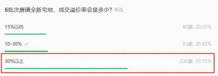 再来说说唐镇全新宅地,将在13天后开拍(7月24号),小胖看房之前曾做过投票统计,超59%的人认为最终成交溢价会超过30%