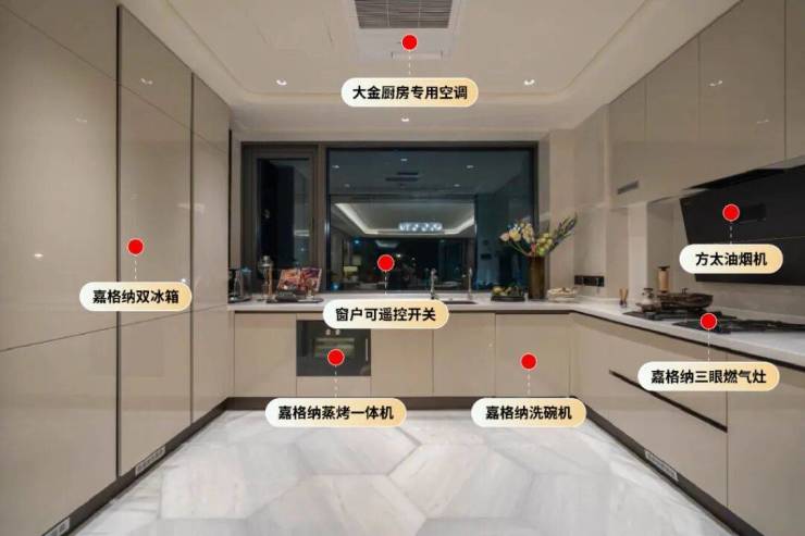 使用频率最高的厨房和卫生间。厨房:嘉格纳五件套(分体式三眼燃气灶、冰箱、蒸烤一体机、洗碗机);卫生间:唯宝的台盆、浴缸,汉斯格雅龙头和花洒。