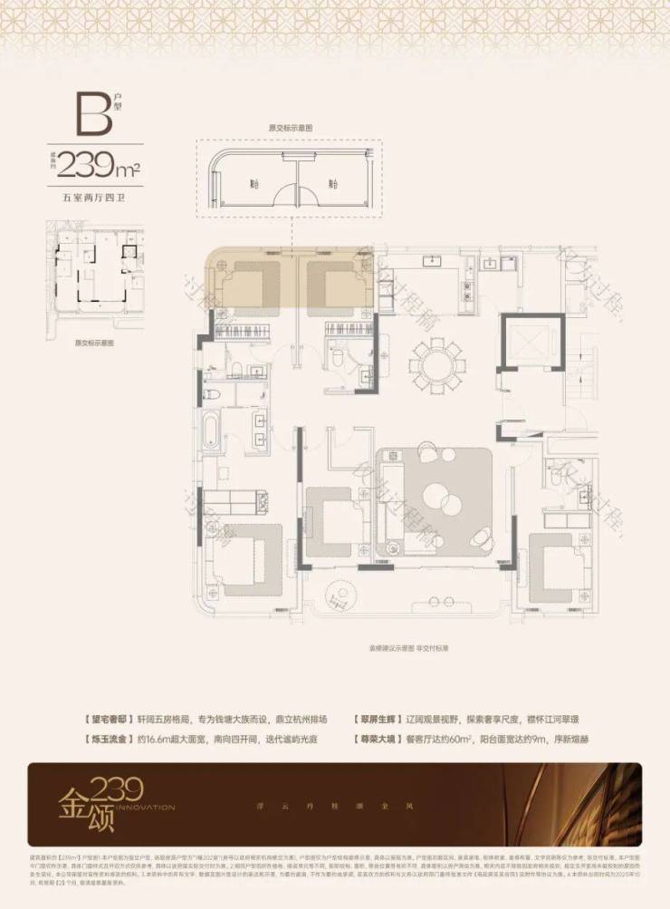 1#:主力建面约239方,五房两厅四卫格局,控总价,尺度感和功能兼具。