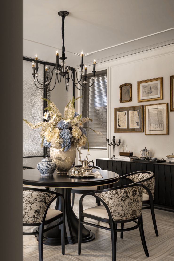 洗練純淨的白、高貴典雅的黑為色彩主調,詮釋了經典的海派風格,提升空間的縱深感與層次感同時空間顯得更加深邃。