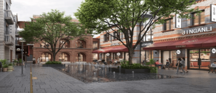 设计融合海派石库门元素与现代美学:外立面采用红砖青砖与玻璃结合,保留虞氏故居、泰山大剧院等历史建筑,社区内打造“四纵三横巷弄+三大中庭花园”景观。13