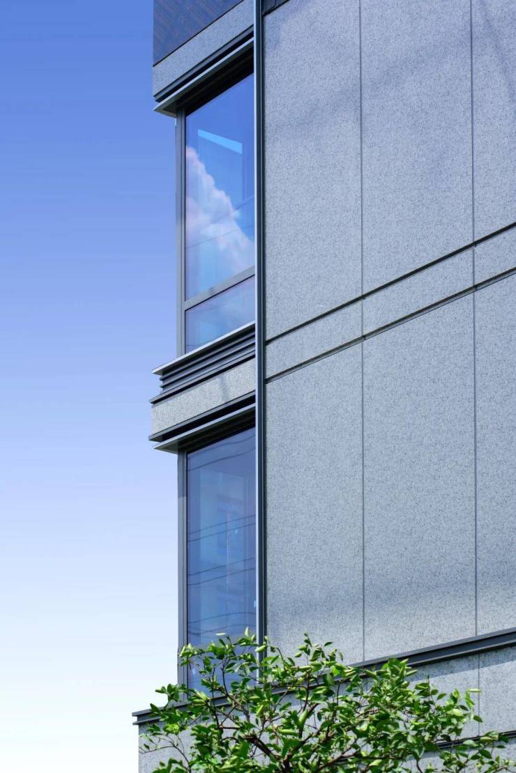 立面材料用的是“ 铝板+玻璃幕墙+石材基座”。