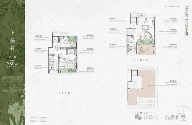 建面约289方上叠户型,一层阳台、主卧套间连通,阳光次卧、星级客房,还带家庭厅;二层宽境大露台、餐客厅、厨房等,可打造洄游式欢聚场……
