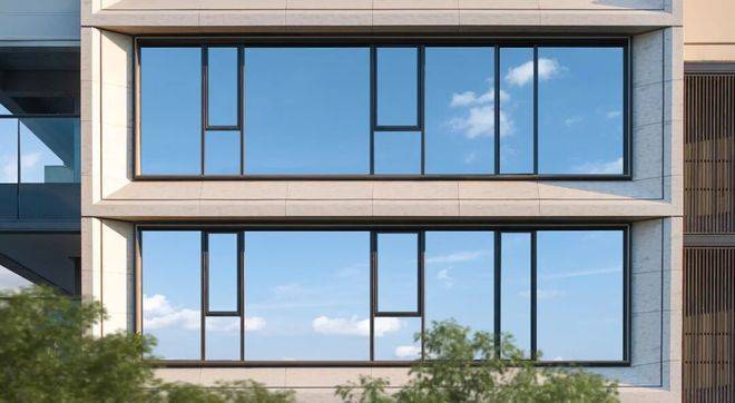 在近人尺度使用沉香米黄石材,以石材的厚重与质感彰显归家的仪式;2层以上采取仿石铝板,以几十种花纹进行拼接,模拟石材分缝,形成方正有序的凹凸进退关系,强化立面的光影效果,既有石材的质感,又实现了更强的外立面造型。