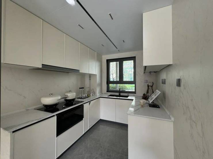 厨房移门是类似于水波纹的三移门,不占空间,上轨道设计,更易于日常清扫。