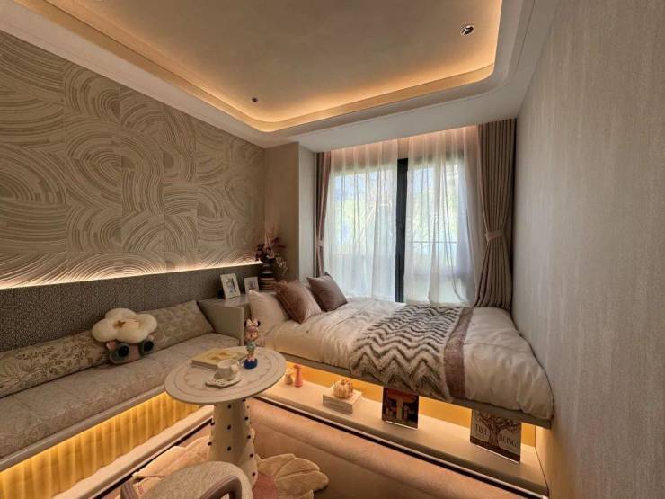 样板间3房做的是边套,今年非常流行的L型转角大飘窗也安排上了,采光视野更佳。