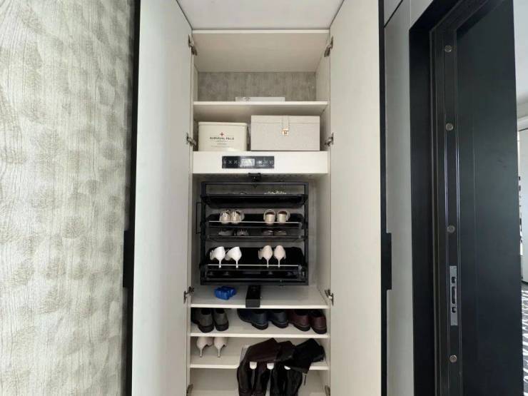 入户门是是非常有质感的铸铝门,带电子猫眼智能门锁;进门后是一个独立玄关,木纹玄关背景墙,右侧是通顶的悬浮玄关柜,内置鞋柜精灵和抽拉鞋架。