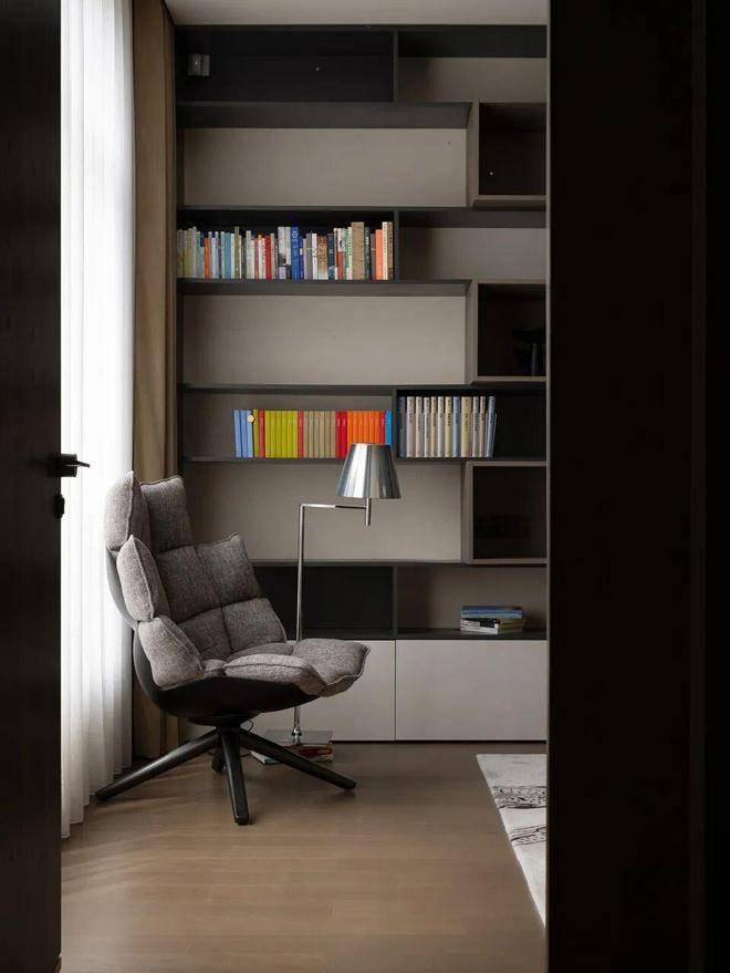 书房则位于一楼的北面,Shawn用FLOS落地灯和B&B ITALIA Husk休闲椅打造了一个休闲角落,即使日常书房敞开,也是一道风景线。