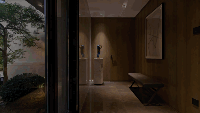 一楼为主要的会客厅,户外庭院和书房,二楼则是更为隐蔽的卧房休憩区,负一楼藏着不为人所知的精神放松地:休闲吧和影音室。