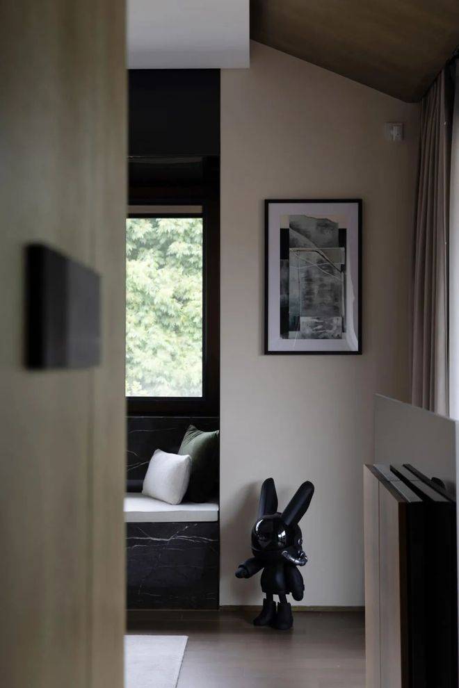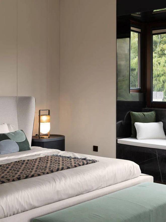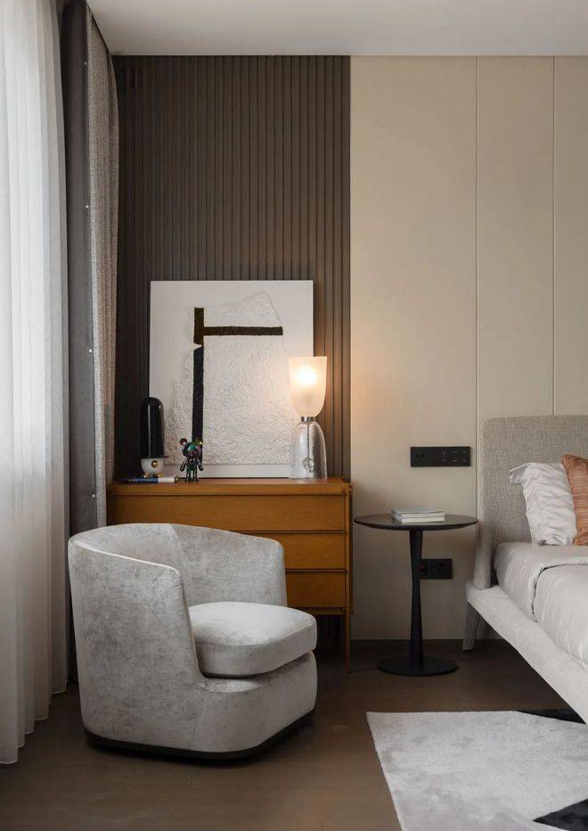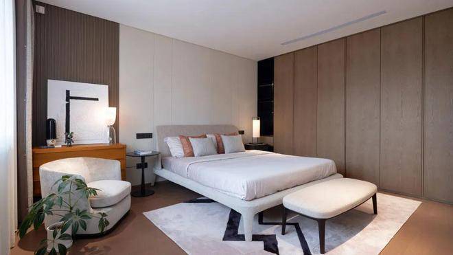 在卧室的材质选择上也更为自然,克制地使用了皮革来增加精致度,其他以面料、木质为主;