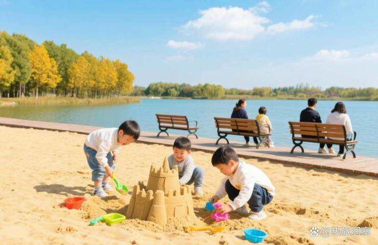 太仓 “城市后花园”,核心是10 万㎡人工沙滩,夏天踩水、秋天赏银杏(插图 3:金仓湖公园沙滩实拍)。还有环湖骑行道,租车 10 元 / 小时,吹风骑行很惬意。