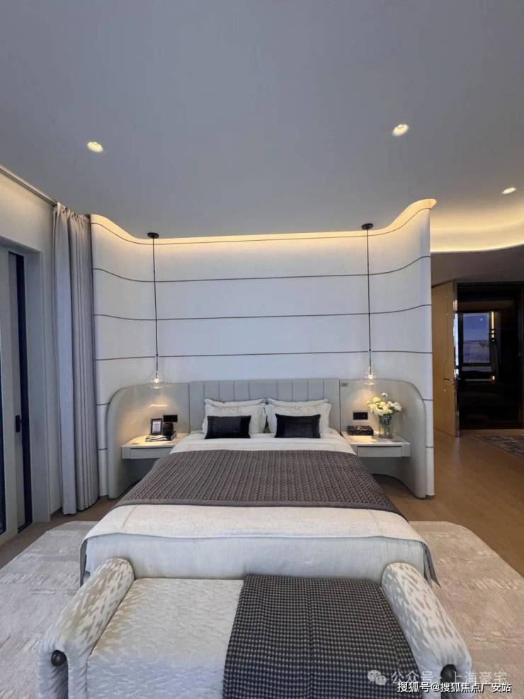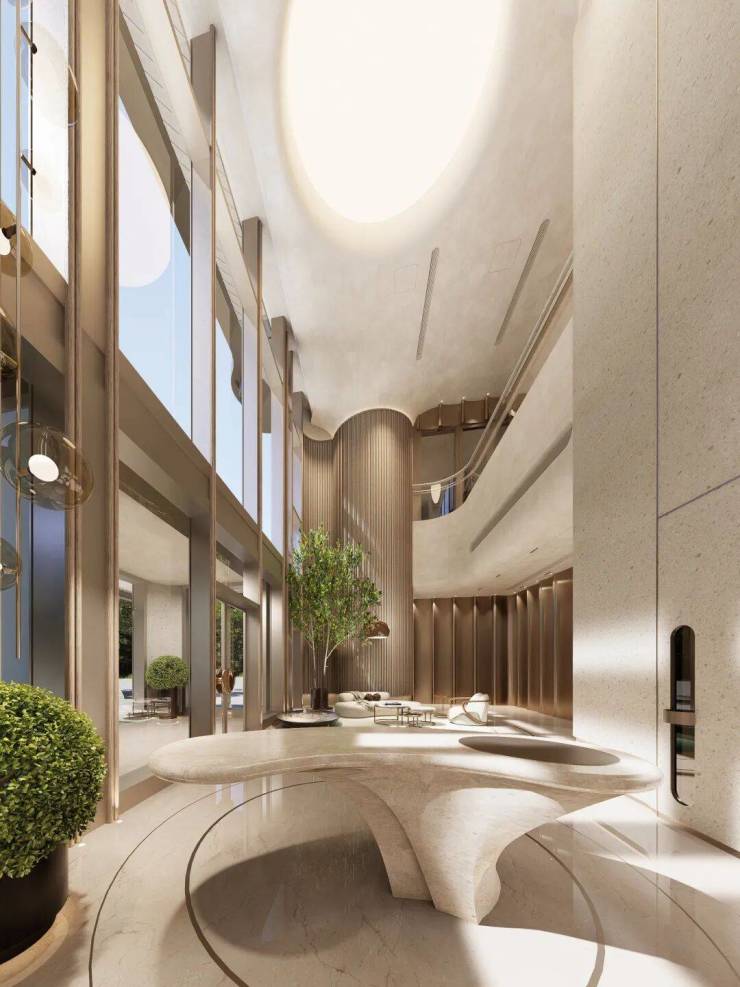 进入一层单元入户大堂,双层挑空约9米。室内的设计风格同样延续了外立面流动波浪的理念,以曲精工彰显空间品质。