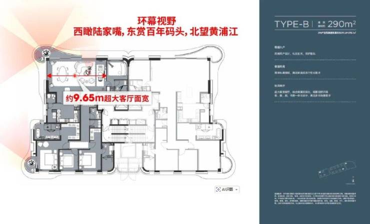 项目即将迎来五批次加推,约180㎡/240㎡/290㎡/388㎡全线产品登场,这其中约290㎡是首开爆款户型,时隔1年后再度返场,江景首排占位,享无遮挡环幕视野。