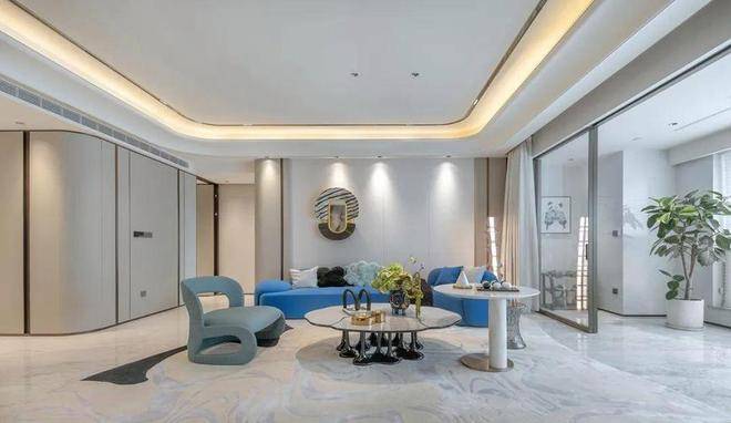 步入样板房内,目之所及,遍布芬迪白、喜马拉雅灰、雪山蓝等名贵奢石,将“浮华”二字堆砌得恰到好处;除此之外,大量深色木饰面的运用,则让整体风格显得低调而沉稳。吊顶、墙面,随处可见的弧形元素,炫技的同时又增添了温馨调性,奢华中带着松弛感。
