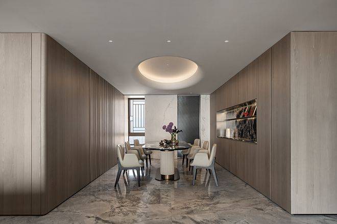 餐厅区域的设计独具匠心。设计师巧妙利用转角空间,通过木质餐椅与大理石地面的材质对话,营造出温馨的用餐氛围。区域尺度经过精确计算,既保证了使用的舒适性,又维持了整体的开放感。