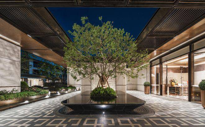 社区入口,百米酒店式落客门庭、超60年树龄铁冬青打造的“大树聚场”、潘多拉发光奢石拼花的“躺平水院”,是家人休憩、邻里小聚的好去处;
