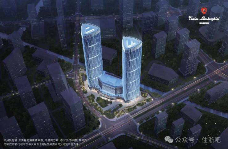 【建筑规划】:T1、T2为250米双塔楼(60层,T1写字楼、T2杭州托尼洛·兰博基尼行政公寓)、T3裙楼(12 层,杭州托尼洛·兰博基尼酒店)