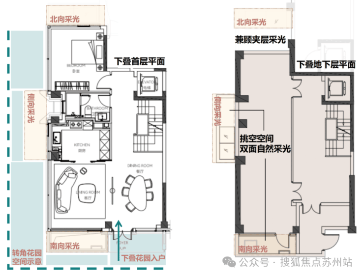 在全新开放的叠墅样板间中,可以看到叠墅产品不仅在南北两个方向,边套还在侧向都做了地下采光,再也不用担心地下室昏暗潮湿。