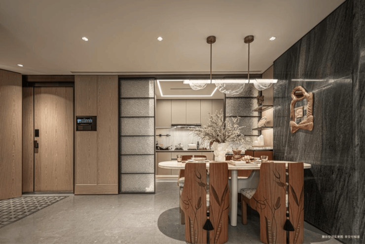 采用米黄色温润石材,巧妙模拟风的流畅形态,营造出既庄重又舒适的归家氛围。这片宽广的流线型石墙在柔和灯光的映衬下,更显璀璨夺目,而风雨连廊的灯带设计,更添一份尊贵仪式感。