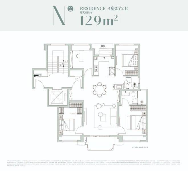 该户型是经典的四叶草布局,四开间分布在四角,兼顾私密与互动,是二胎家庭的优选;