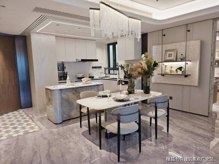 入户这座铸铝门,质感厚重;通顶玄关柜,内置消毒精灵,奢石把手+奢石台面更显海派温润气质,玄关地面都铺上了海上·清和玺的logo拼花,小小玄关做到了既实用又美观。
