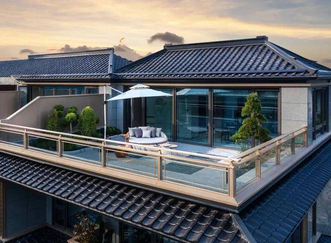 三重屋檐,代表天地人融合的东方宫殿最高等级,上檐、外檐、下檐三重结构,现代立面,以铝板、格栅、石材、瓦墙型材、玻璃等现代型材,彰显传世之宅的独特气度。