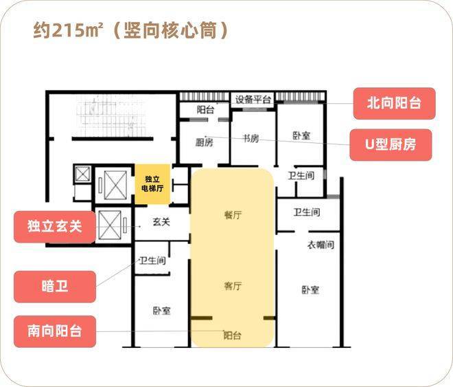 215㎡的纵置核心筒户型,与横置核心筒相比,整体布局更加紧凑,但功能分区同样出色。