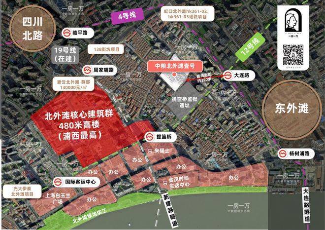 作为上海唯一与外滩历史风貌区、陆家嘴国际金融区形成鼎立之势的滨江板块,北外滩通过大连路隧道、新建路隧道与陆家嘴形成10分钟通勤圈。