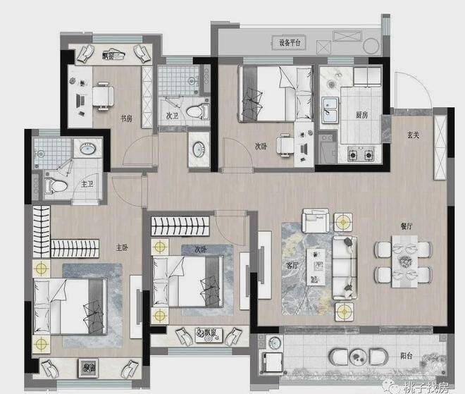 118㎡户型在设计上整体方正实用,以经典的“3+1”布局,飘窗设计,保证各个房间采光充沛和空气清新,契合成长型家庭在各个阶段的需求,当家庭迎来二胎或者三代同堂都能从容不迫。