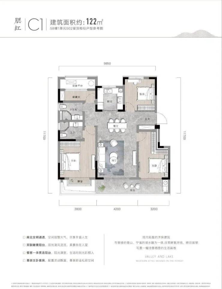 户型点评优势:双阳台设计,完美匹配湖山美景。客餐厨动线合理,观景飘窗连通了室内室外两重空间。南北通透、分区合理,尤其是储藏室的设计,十分贴心。99㎡的大两居,恰到好处地放大了各个功能区,整体看过去十分舒畅。