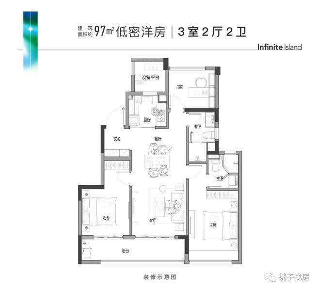 建面约97㎡起步户型,三房两厅两卫格局,南向三开间,次卧与客厅的阳台相连,打造大尺度的双联阳台,还有很大的亮点就是玄关设计,可以很好地护好后期业主的隐私。