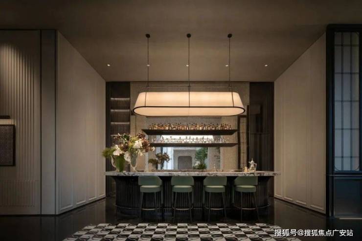 黑白交织的网格地块将“步入其中”的质感体验表达得更加生动而有韵律。入口处的吧台作为空间的基石,沉稳的翠意散发着生命力,起到承上启下的关键作用。