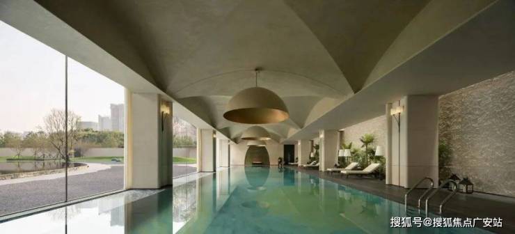 泳池在几何关系中得到了构建,层层叠叠的拱形吊顶拼接,对侧的落地窗映射室外的开阔景观,石质的肌理进行还原表达,分别从视觉与触感上映射自然主义。
