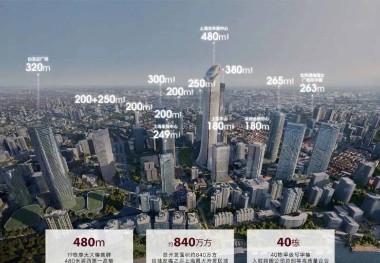 北外滩将建设480米高的浦西第一高楼——上海北外滩中心,未来将携19栋摩天大楼集群共筑上海崭新天际线。
