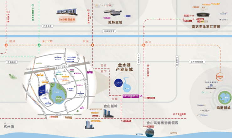 项目地处金山金水湖产业新城内,金水湖产业新城围绕“创业金山、宜居金山、和谐金山”的总体目标,以“绿色生态、低碳节能、智慧互联”为三大特色亮点,打造集居住生活、商务办公、休闲娱乐于一体的现代化智慧新城。
