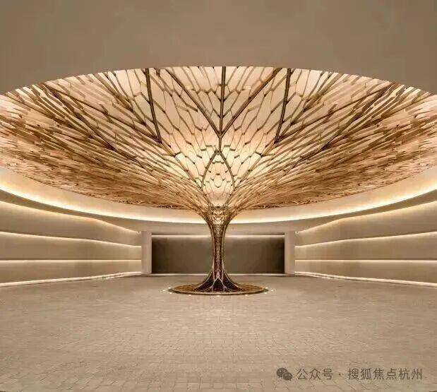 因项目整体抬高,从下沉庭院到架空层“空中花园”的落差极大,形成独特的峡谷地貌,杭序府的设计团队汲取九溪烟树为造园灵感,打造一个立体多维的城市溪谷交互园林;因项目毗邻江岸,杭序府的外立面以“站立的江潮”为灵感,
