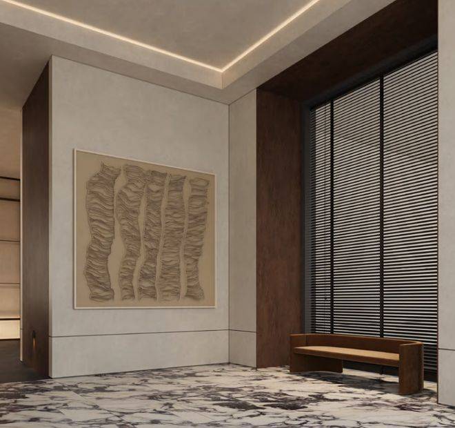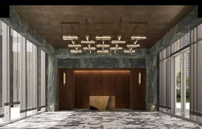 整个项目采用地上+地下三层同标准精装入户大堂,大堂选用有着媲美艺术品表现力的亚马逊绿天然奢石,而且地上地下一脉相承、华贵一致,结合仿古铜不锈钢、艺术壁灯为点缀,将上海的摩登气息注入归家大堂,给业主更强烈的入户仪式感。