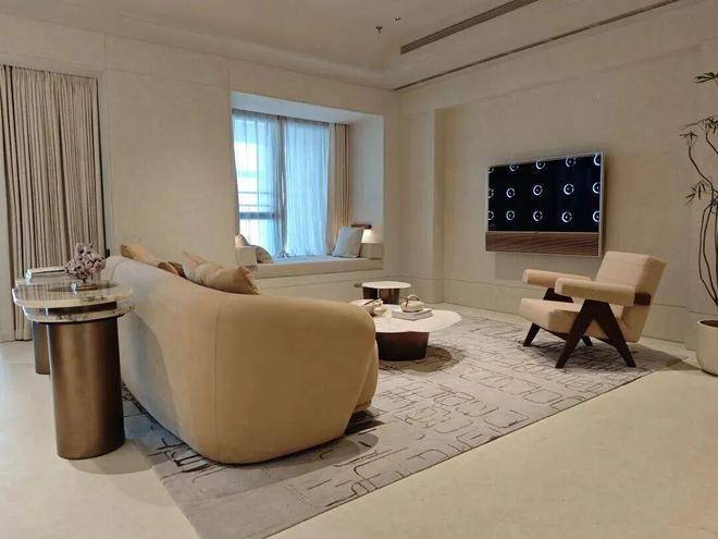 无间为湾上设计的样板间,一进去第一个特别之处就是墙面地面都是石材,整体呈现了米白色的色系,给人很明显的高级感。