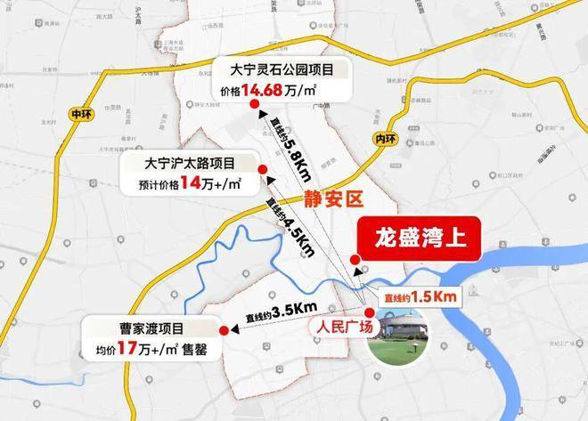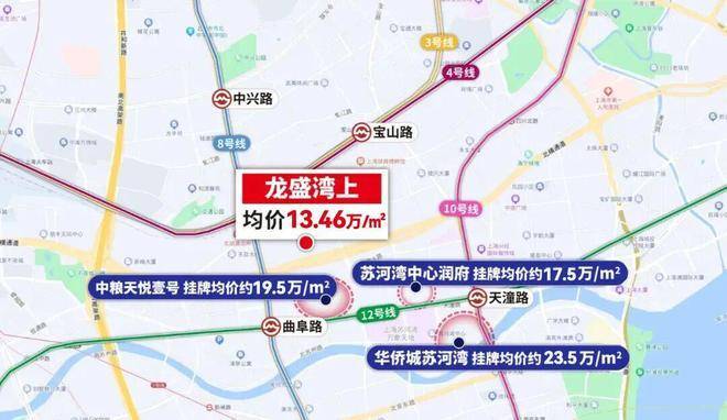 距离项目直线约50米(数据来源:百度地图)的中粮天悦的挂牌均价约19.5万/㎡、直线约500米的苏河湾中心润府挂牌均价约17.5万/㎡。