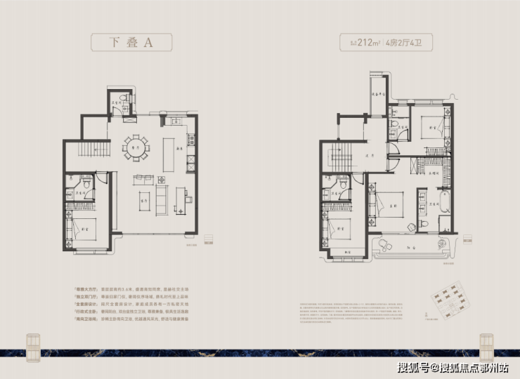 全套房设计,提升居住舒适度。上下叠各有ABC三种户型,面积在212-280平之间,且所有户型为全套房设计,主卧更是可实现“小家化”布局,家庭成员各有一方私密天地,享受更加舒适、静谧的墅居生活体验。