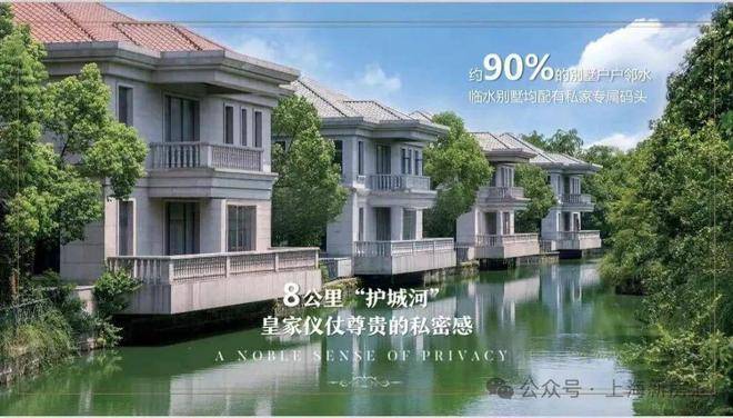 项目规划配有大量草地绿地、树木、各种花草,开挖护城河道,形成1个半岛+13个小岛的分布格局,还在公路旁种植具有观赏和隔音作用的树木,西侧的花墙长达一千米多,力求成为一个一面临山、四周环河、安然静谧的佘山别墅“世外桃源”。