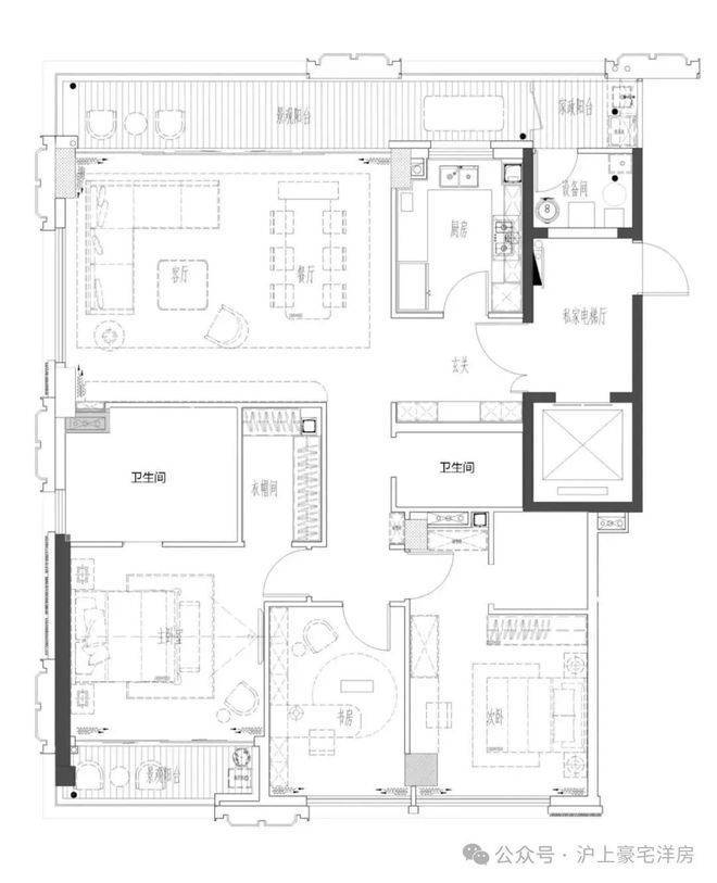 空间哲学:动静分离动线设计,4间套房均配备独立卫生间,主卧设男女衣帽间,空间转角大量采用弧形设计,兼顾美学与安全。