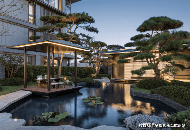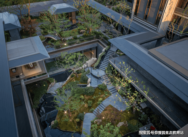 再往里走就是近460㎡的下沉式庭院,精选太行山金景石堆叠成小山丘,引进溪水汇聚成池塘,并移栽岭南珍贵的古桩铁冬青和中华原生乌桕树,形成一幅立体山水画卷。