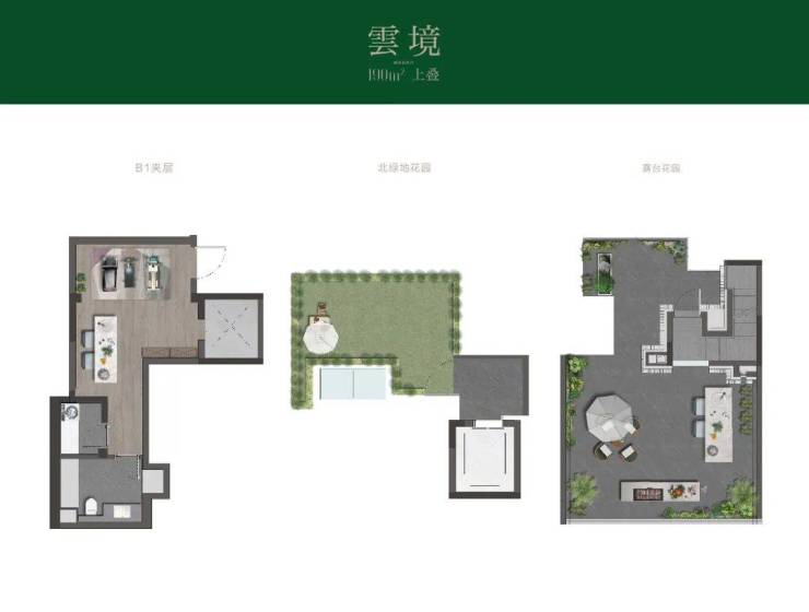 上叠从北绿地花园入户,经私家电梯直接进入3层或4层室内空间,或进入B1夹层地下室。